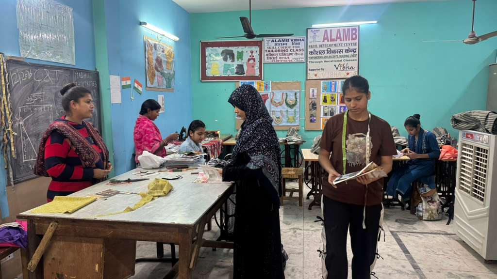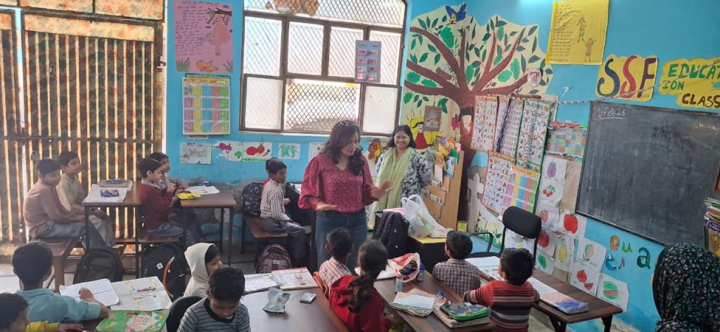 SSF volunteer guiding children at the Alamb project in Uttamnagar, Dehli.